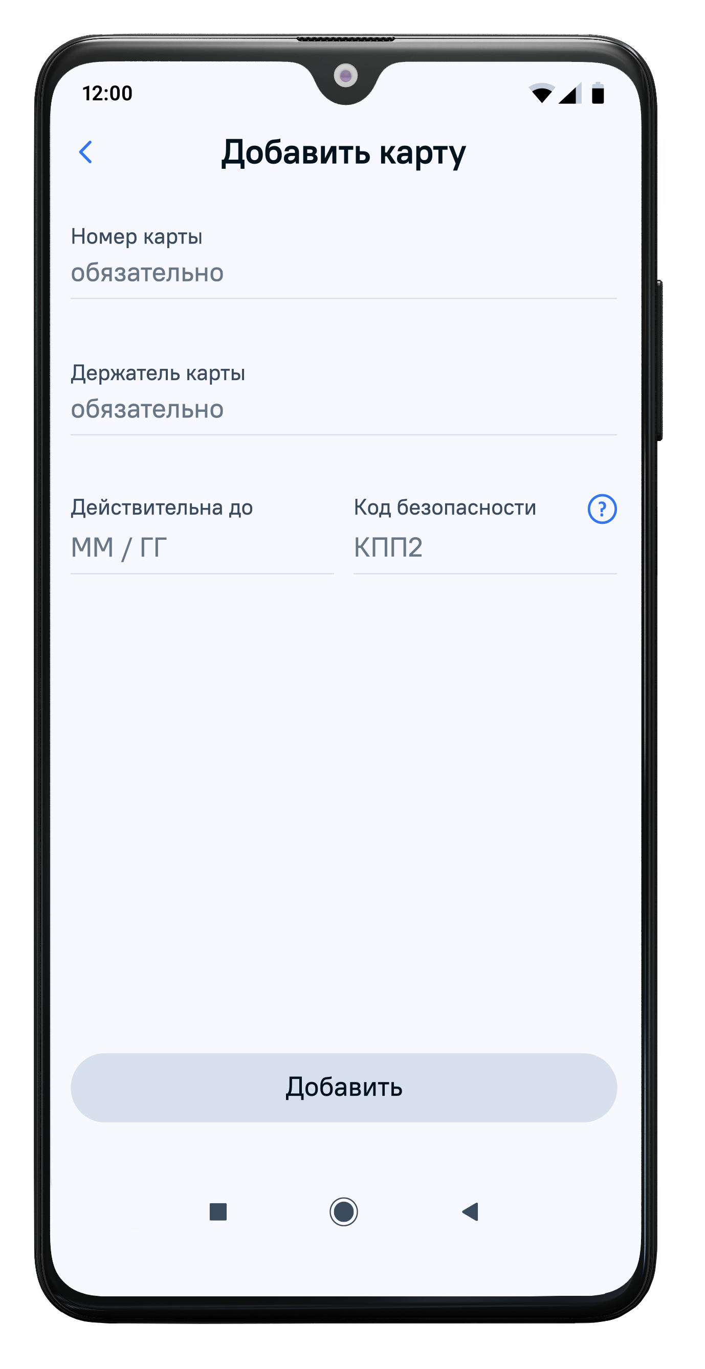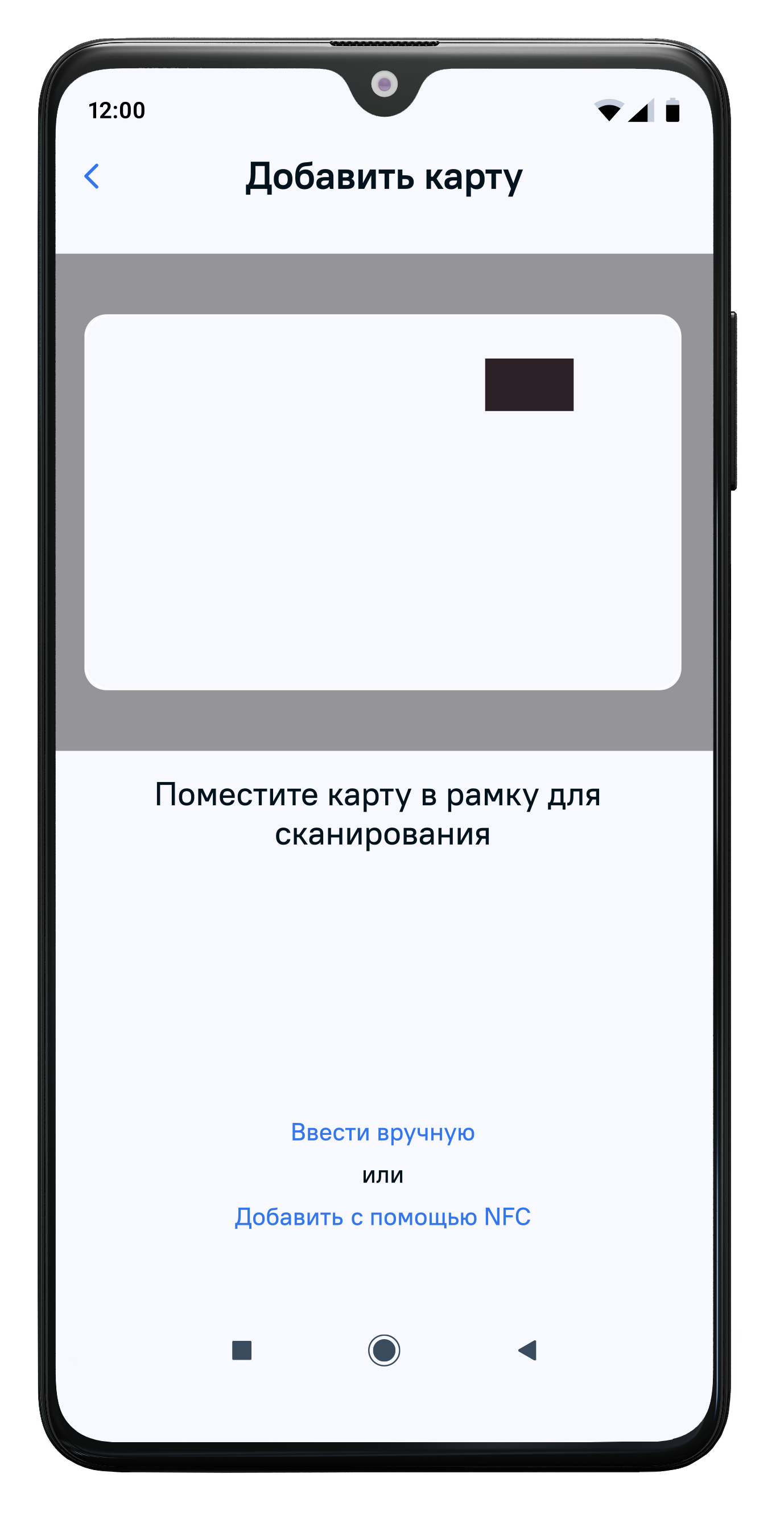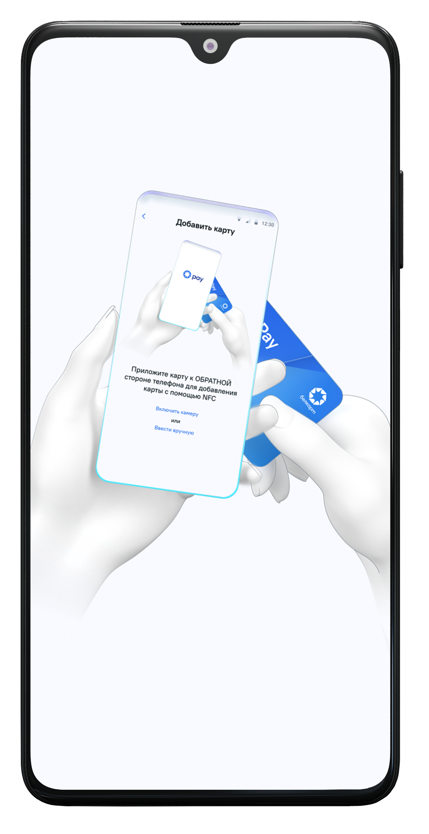 Шаг 2.Выберите удобный способ добавления данных карты:по умолчанию предлагается добавить карточку по NFC, приложив карту с обратной стороны устройства. Для считывания данных предусмотрено 30 секунд. Номер карты и срок действия карты автоматически синхронизируется, вручную необходимо ввести имя держателя и код безопасности КПП2. cчитыванием реквизитов карты с помощью камеры смартфона ввести реквизиты карты вручную: номер карты, имя держателя, срок действия карты и код безопасности КПП2 * КППП2 - код безопасности из 3-х цифр на обратной строне карточки ![]() ![]()